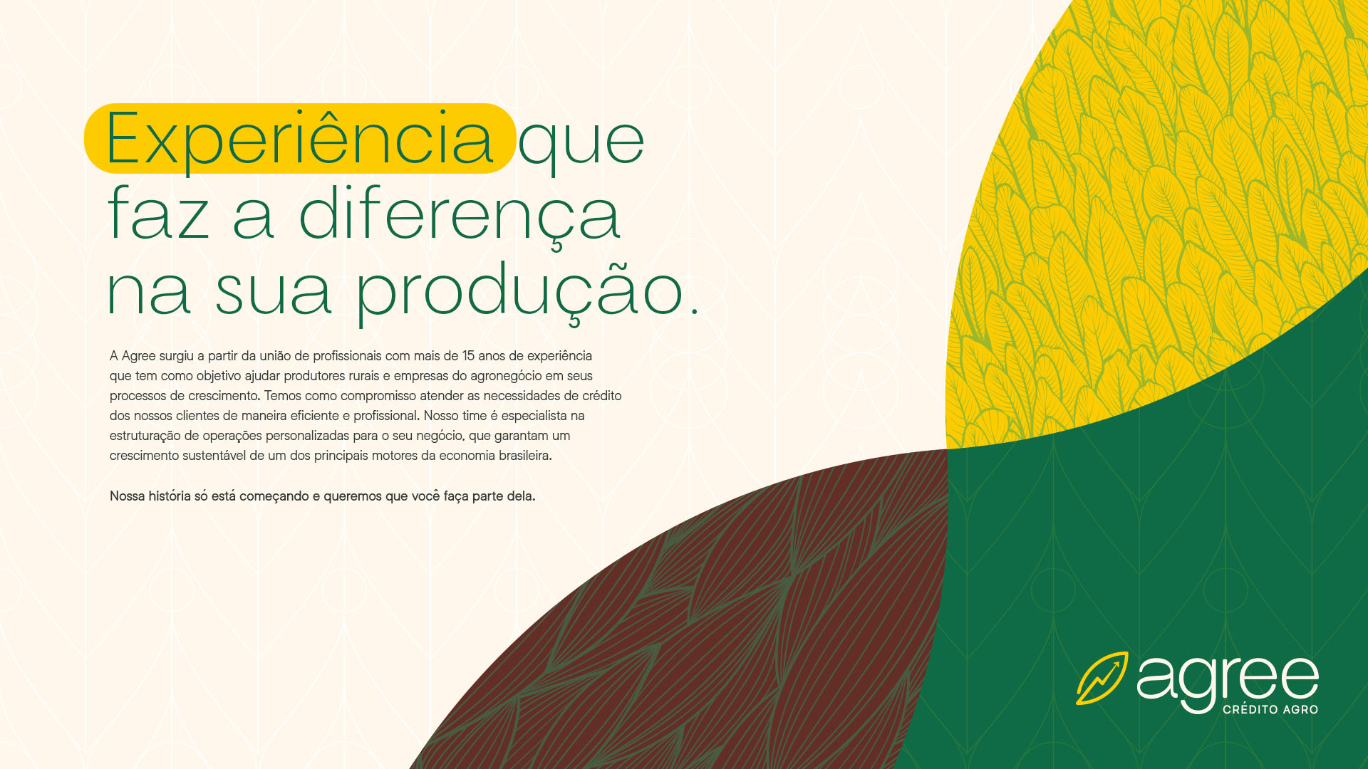A Agree é uma empresa que conecta produtores rurais e empresas do agronegócio a melhores oportunidades de crédito. Seu diferencial é sempre prezar pelo contato próximo, e não apenas através de aplicativos e demais plataformas, criando uma experiência diferenciada pelo contato e facilitando todo o processo para os seus clientes.
