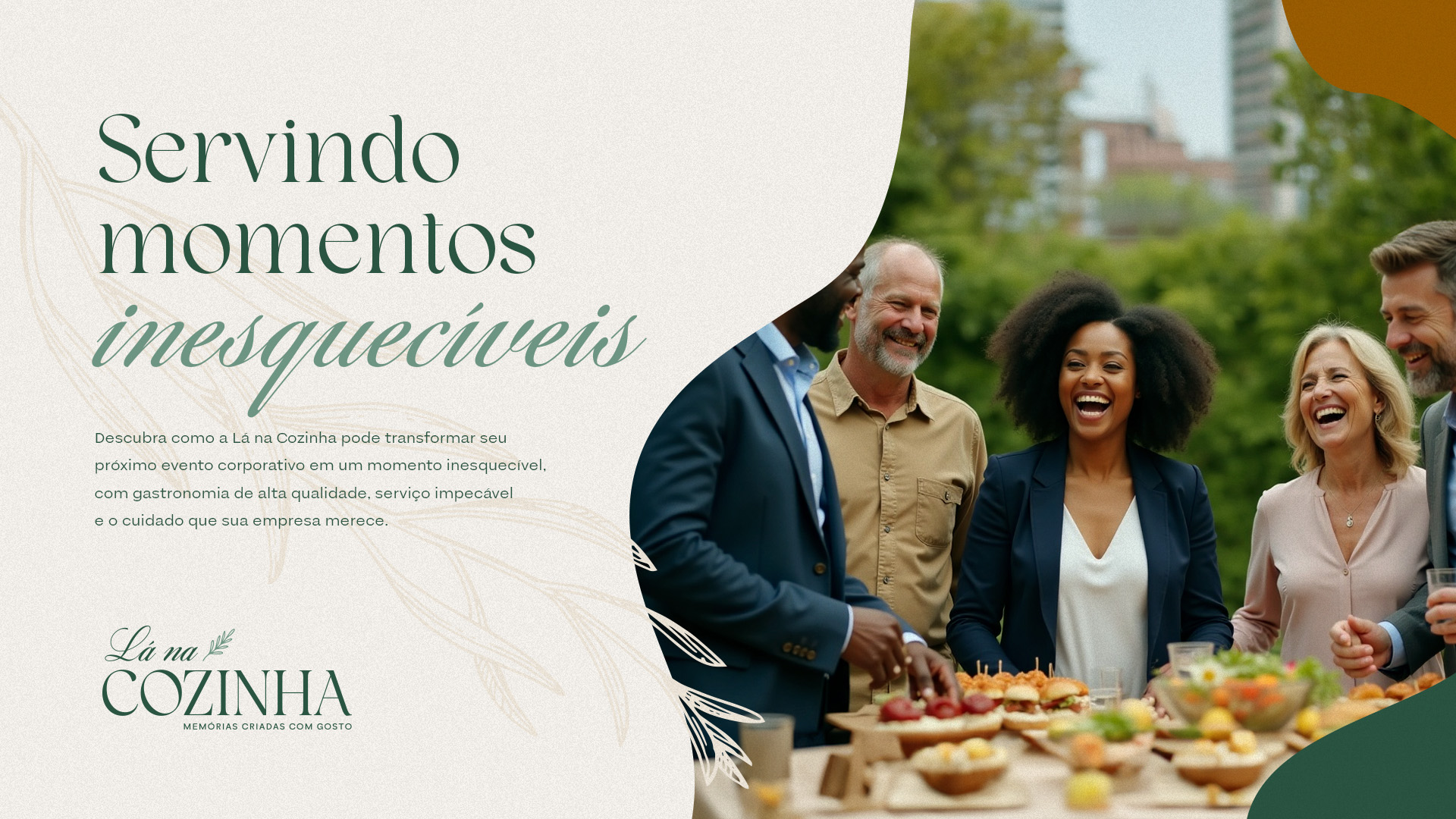 A Lá Na Cozinha é uma empresa especializada em catering para eventos corporativos de alto padrão, que entrega experiências gastronômicas únicas, criativas e personalizadas, com total comprometimento, atenção aos detalhes e práticas sustentáveis. Movida pelo prazer de proporcionar momentos inesquecíveis por meio de comida de verdade e serviço de alta qualidade, atende diretores, gerentes e donos de empresas com alto padrão de exigência, que buscam experiências elevadas aliadas a um serviço impecável, seguro e eficiente, gerando resultados positivos e memoráveis para seus eventos.